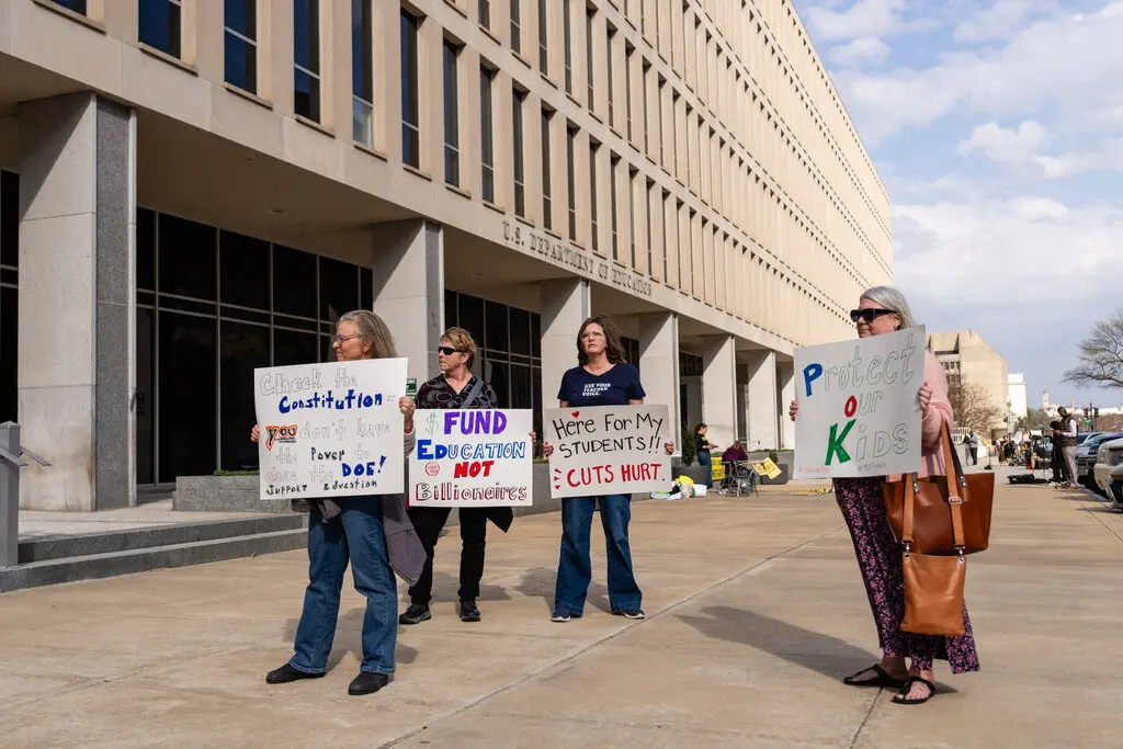 Demonstrators protested the dismantling of the Education Department in March.Credit...Eric Lee/The New York Times.
