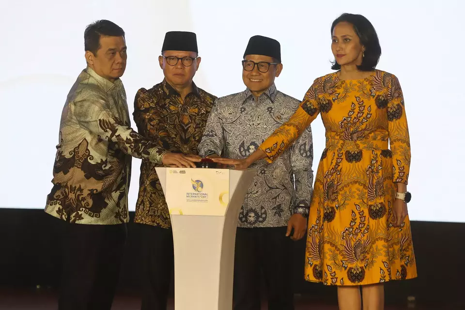Migrant Worker Protection Minister Mukhtarudin, second left, and Coordinating Minister for Community Empowerment Muhaimin Iskandar, second right, launch the 2025 International Migrants Day commemoration at Taman Mini Indonesia Indah in Jakarta on Thursday, December 18, 2025. (David Gita Roza). Source: Jakarta Globe.