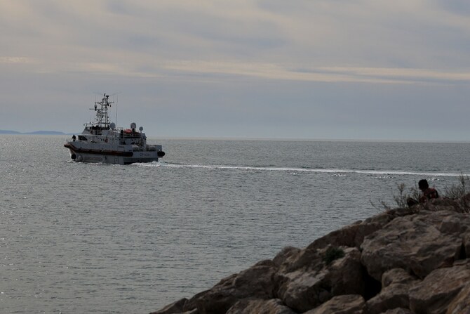 An Italian coastguard ship leaves leaves the Shengjin Port in Albania (AFP). Source: Arab News.