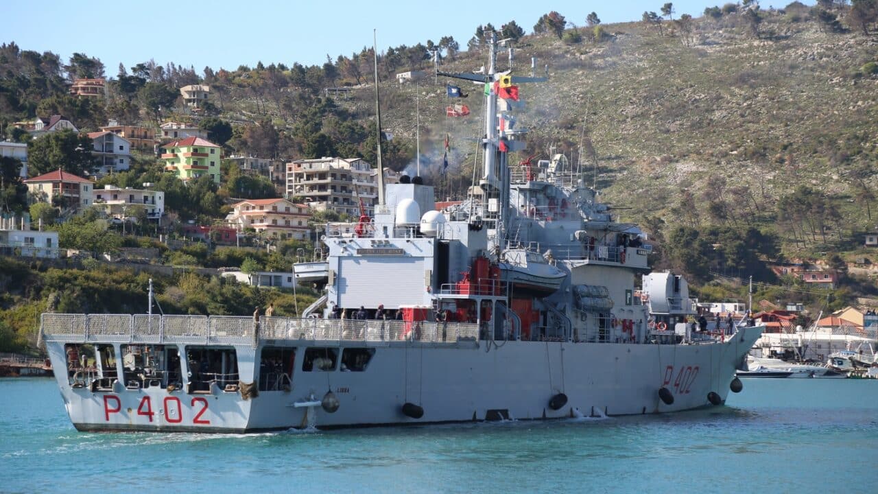 The Italian naval ship ‘Libra’ arrives in Shengjin, Albania, 11 April 2025. It departed from Brindisi with 40 migrants on board, mandated for transfer to a facility in Gjader, Albania. Photo: EPA-EFE/MALTON DIBRA. Source: Balkan Insight.