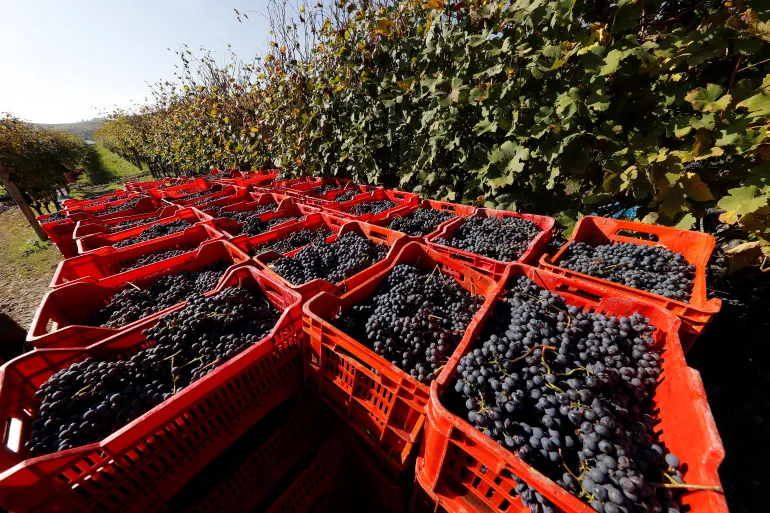 Cages full of red wine grapes are seen during harvest in Barolo [File: Stefano Rellandini/Reuters]. source: Aljazeera.