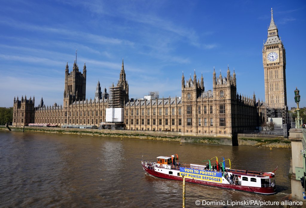 From file: A ship with a protest banner against sending migrants to Rwanda in front of the Houses of Parliament in London on April 20, 2022 | Photo: Dominic Lipinski/PA/picture alliance. Source: Infomigrants.
