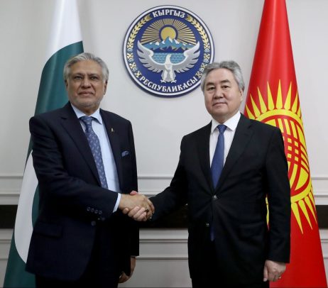 Pakistani Deputy Prime Minister and Foreign Minister Ishaq Dar (left) with Kyrgyz Foreign Minister Jeenbek Kulubayev in Bishkek, Kyrgyzstan, on May 22. Source: The Diplomat.