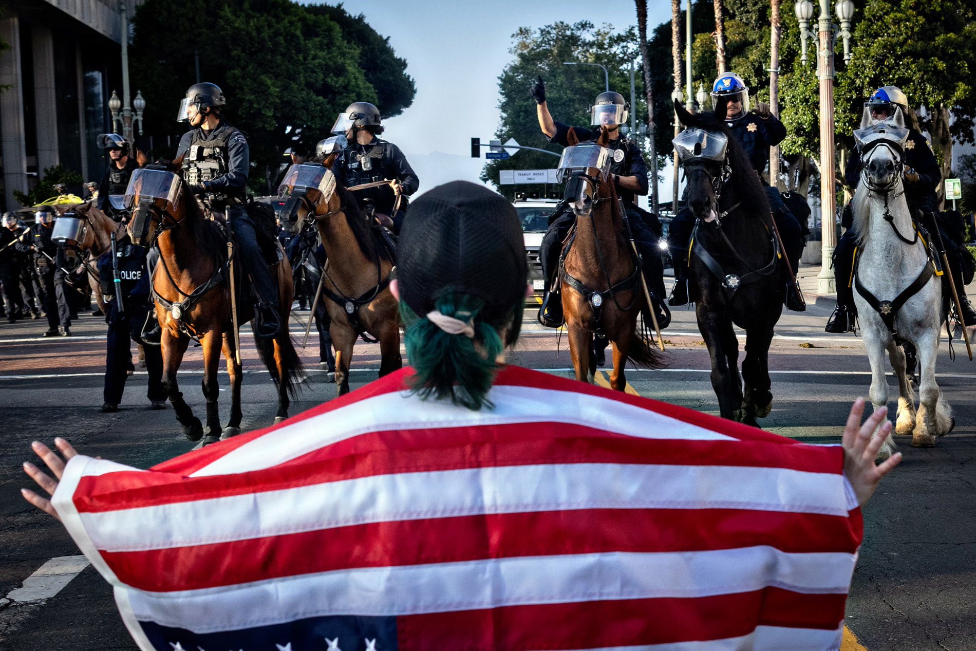Demonstrators continue to clash with law enforcement near City Hall over immigration raids in LA. Photograph: Jason Armond/Los Angeles Times/Getty Images. Source: The Guardian.