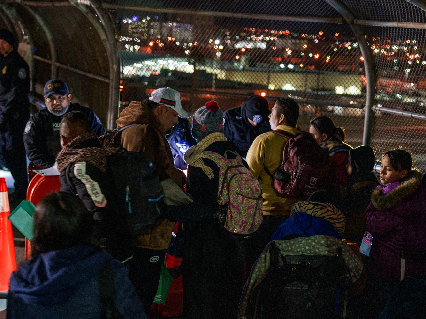 Hondurans David Melgar, 28, his wife Gabriela Maradiaga, 26, and their son Tailer Melgar, 8, have their paperwork checked by CBP agents atop the Paso del Norte Bridge to be allowed into the United States for their CBP One appointment in Ciudad Juárez, Mexico on Monday, December 9, 2024. The family waited only a few weeks to get the appointment in southern Mexico. Paul Ratje for NPR
