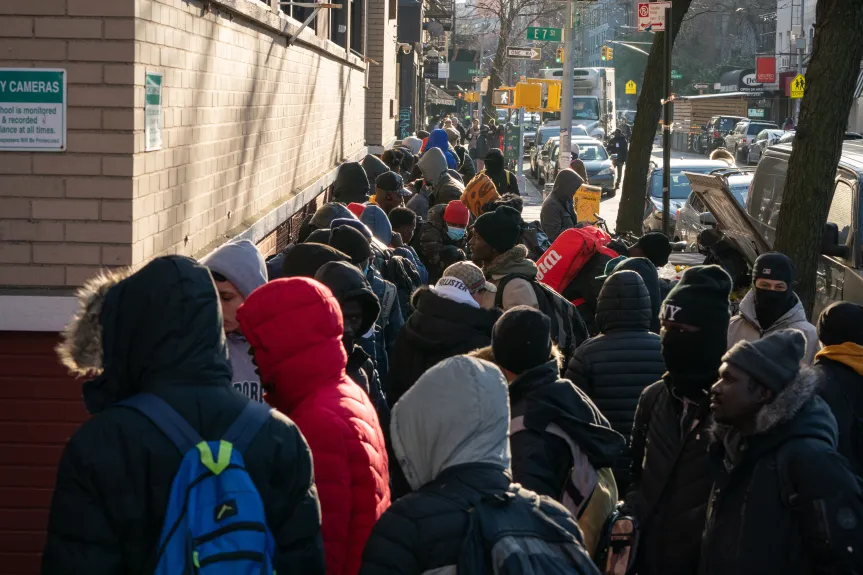 Migrants line up outside a migrant re-ticketing center at St. Brigid School on E. 7th St. Jan. 5, 2024 in Manhattan. (Barry Williams for New York Daily News).