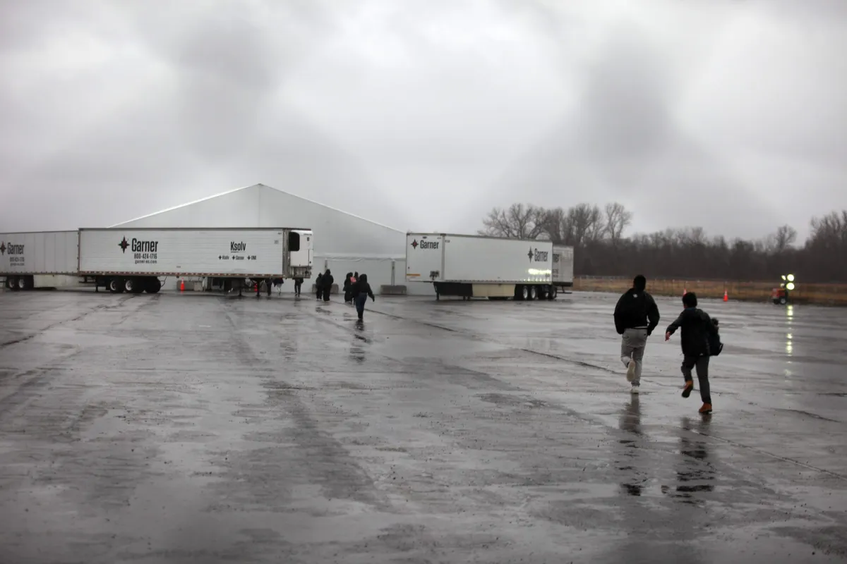 A group of migrants run toward a family shelter at Floyd Bennett Field as a rainstorm descended on the city, Jan. 9, 2024. Credit: Alex Krales/THE CITY.