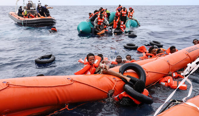 Migrants who fell in the water struggle to cling on to a a float before being rescued by a humanitarian rescuers, around 35 miles away from Libya, in the Mediterranean Sea, Oct. 18, 2021. (AP). Source: Arab News.