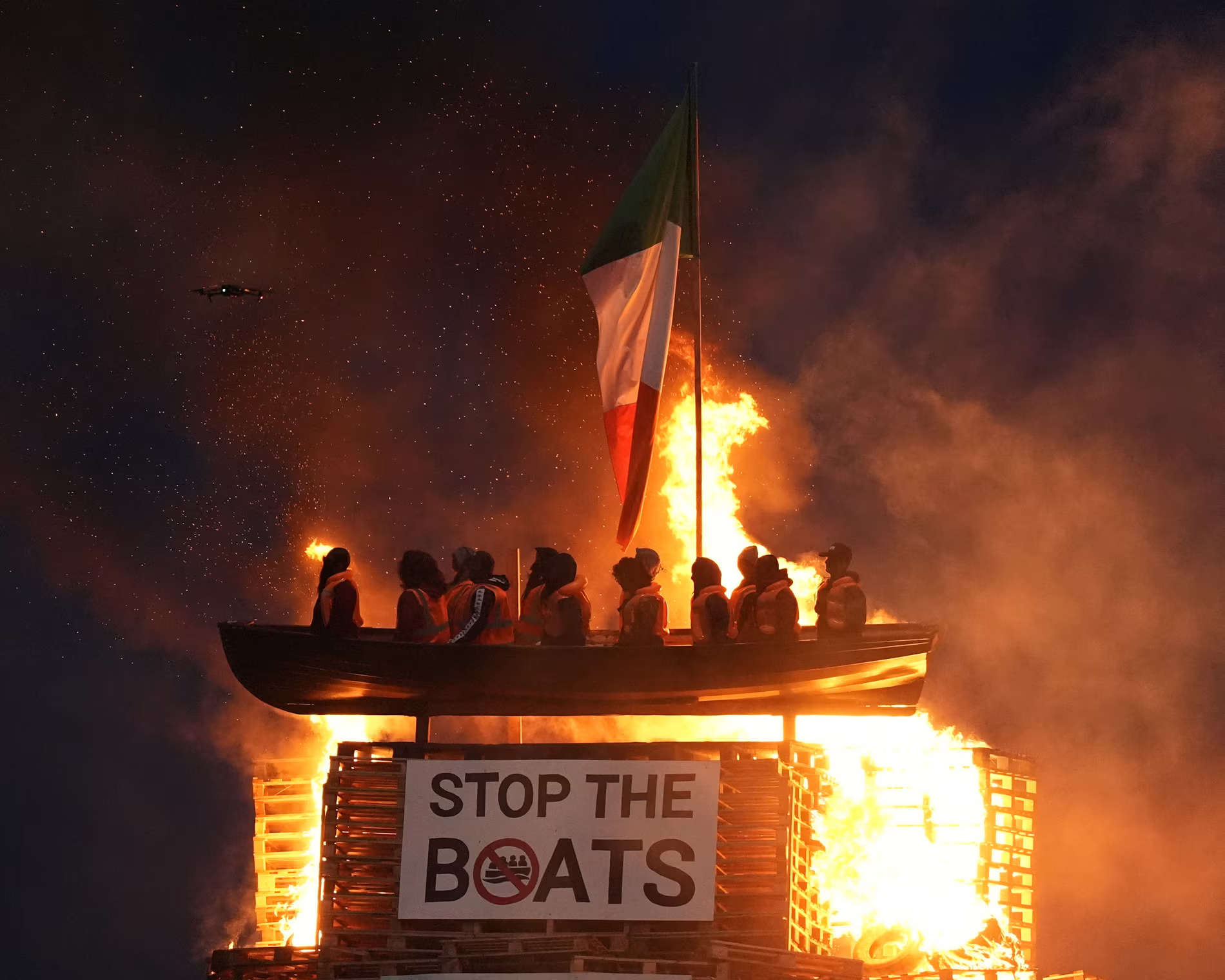 The effigies were made to look like refugees. Signs placed beneath the boat read “stop the boats” and “veterans before refugees.” An Ireland flag was also thrown into the fire. The bonfire was part of a wider cultural event linked to loyalist traditions.