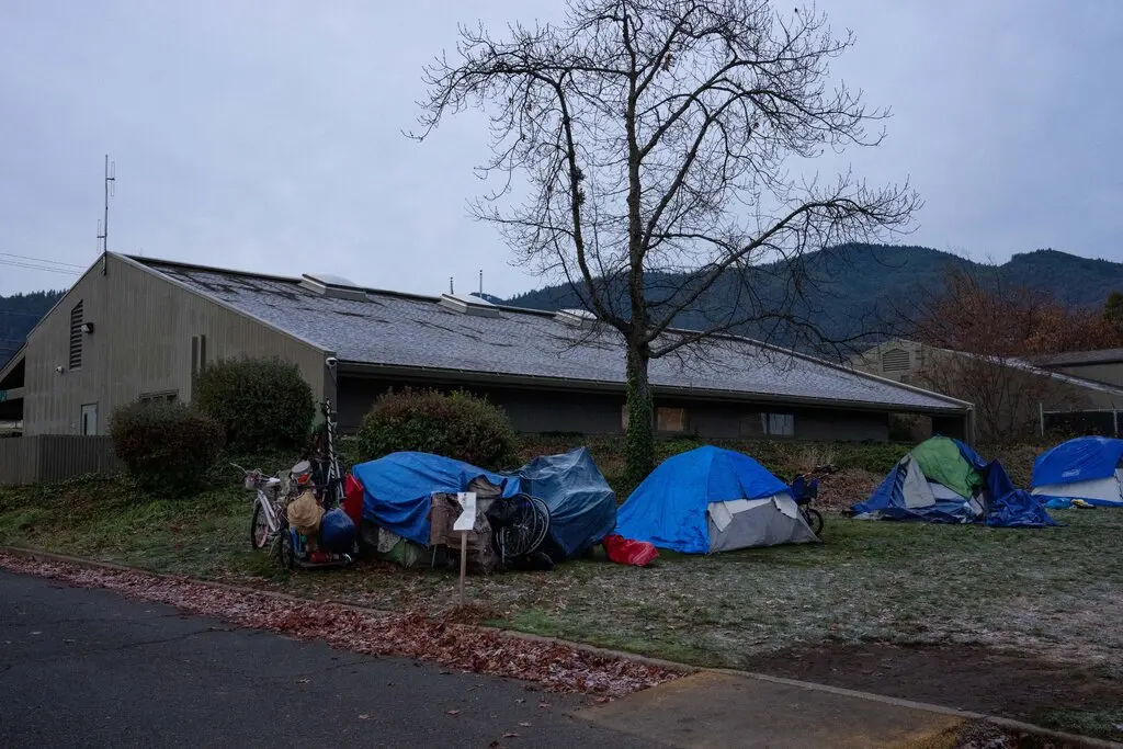 Tents of unhoused people in Ashland, Ore., this month.Credit...Ruth Fremson/The New York Times.