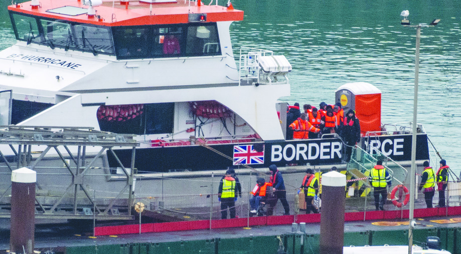Migrants disembark at the Port of Dover in southern England on Sunday from a Border Force vessel after they were intercepted crossing the English Channel. CHRIS J. RATCLIFFE/REUTERS . Source: China Daily.