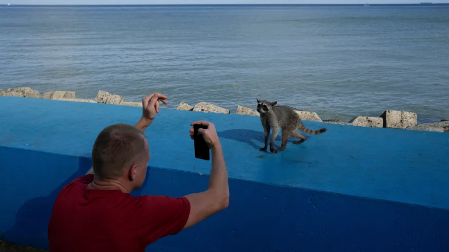 Aleksandr Surgin, a Russian migrant deported from the U.S., photographs a raccoon on the waterfront after visiting the Canadian Embassy in Panama City, in an attempt to seek asylum, Tuesday, March 18, 2025. (AP Photo/Matias Delacroix). Source: ABC50 NOW.