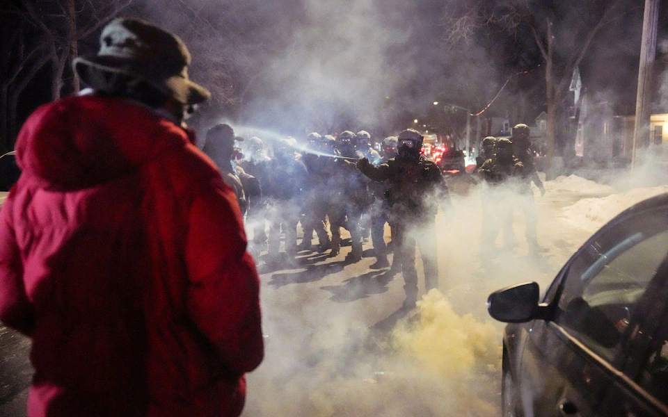 Ice agent sprays a chemical towards a protester during clashes in Minneapolis Credit: Leah Millis/Seth Herald. The Telegraph.