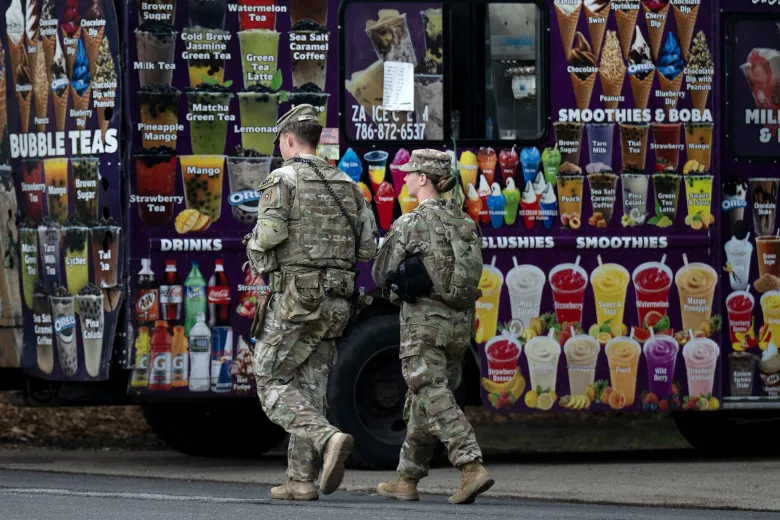 Members of the National Guard patrol the National Mall on Sept. 17, 2025, in Washington, D.C. Credit: BRENDAN SMIALOWSKI/AFP via Getty Images. Source: Prism.